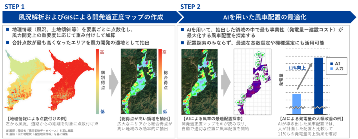 そこで、この課題に立ち向かったのが「適地検索システムと風車の配置最適化AI」の開発プロジェクトです。